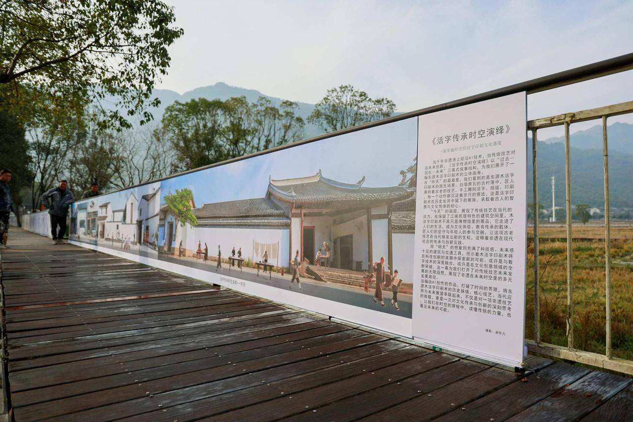 本次展览采取“城市-乡村”双点联动模式,主展场设于故事的发生地——东源村,分展场则位于瑞安市忠义街历史文化街区。展陈设计亦注重与地方空间的融合,在东源村,展览自广场延伸,与村落环境浑然一体,既荟萃了全省11支摄影战队视角独特、叙事生动的精选之作,也着重展示了温州瑞安东源村摄影战队的自选题作品,《活字传承时空演绎》《蓝夹缬与草木色的时光邂逅》等作品联袂展出,共同绘就了一幅非遗传承与创新发展的生动画卷。在瑞安市忠义街历史文化街区,木活字代表性传承人长卷全景展示,辅以其他乡村生活影像,形成张弛有度的叙事节奏,推动文化成果从乡土生长,并向城市空间延伸。